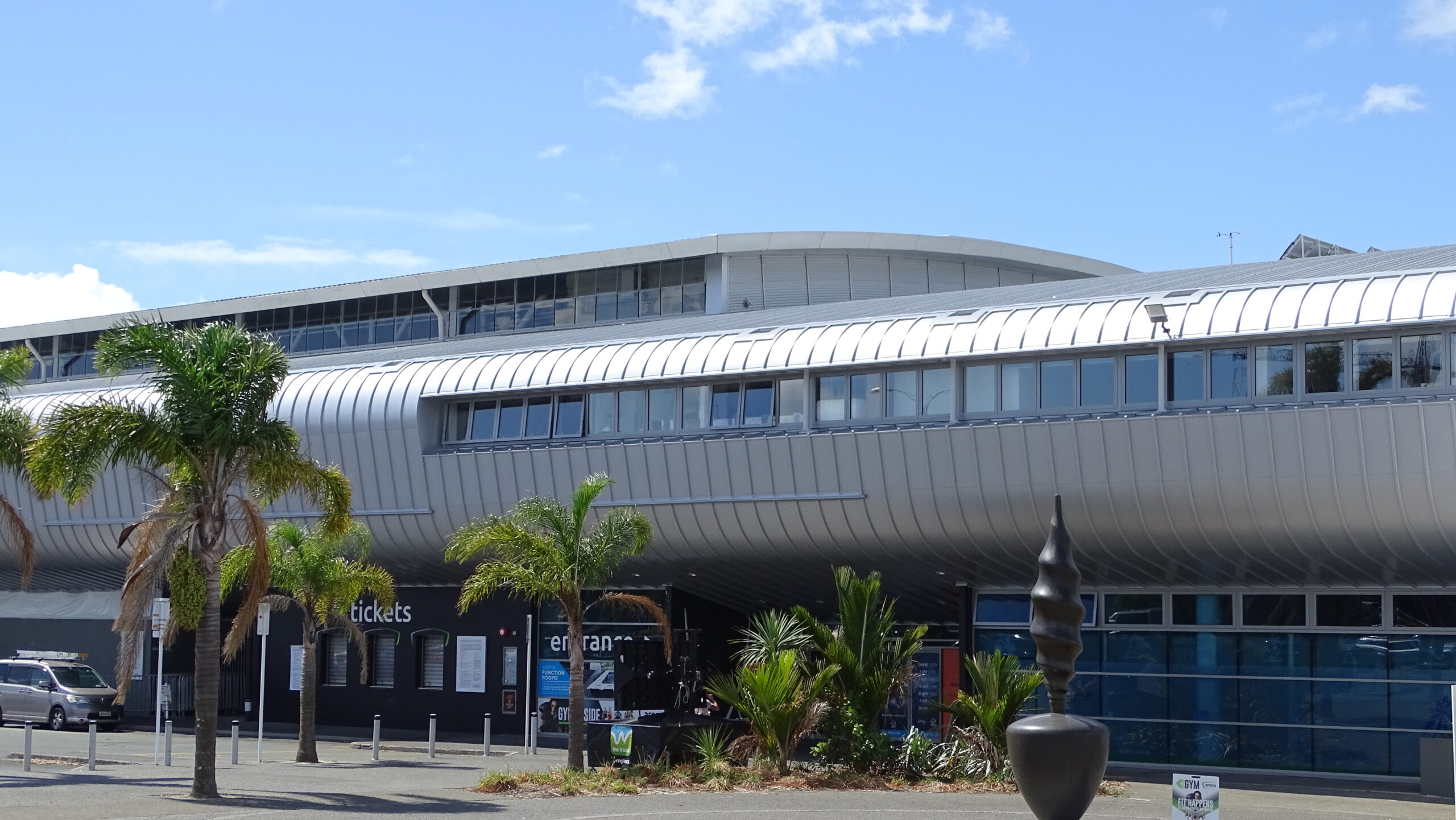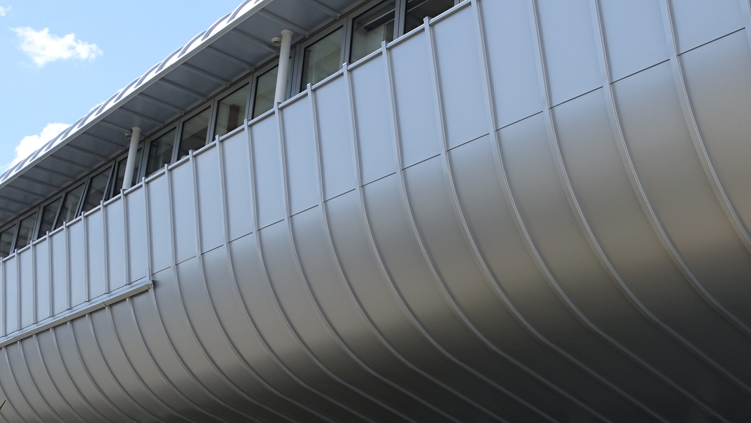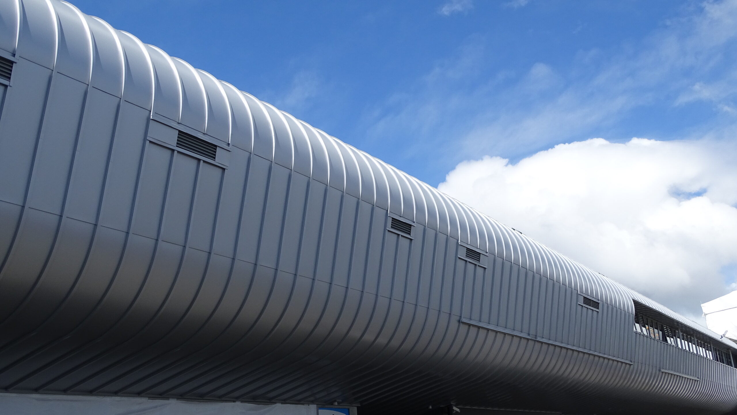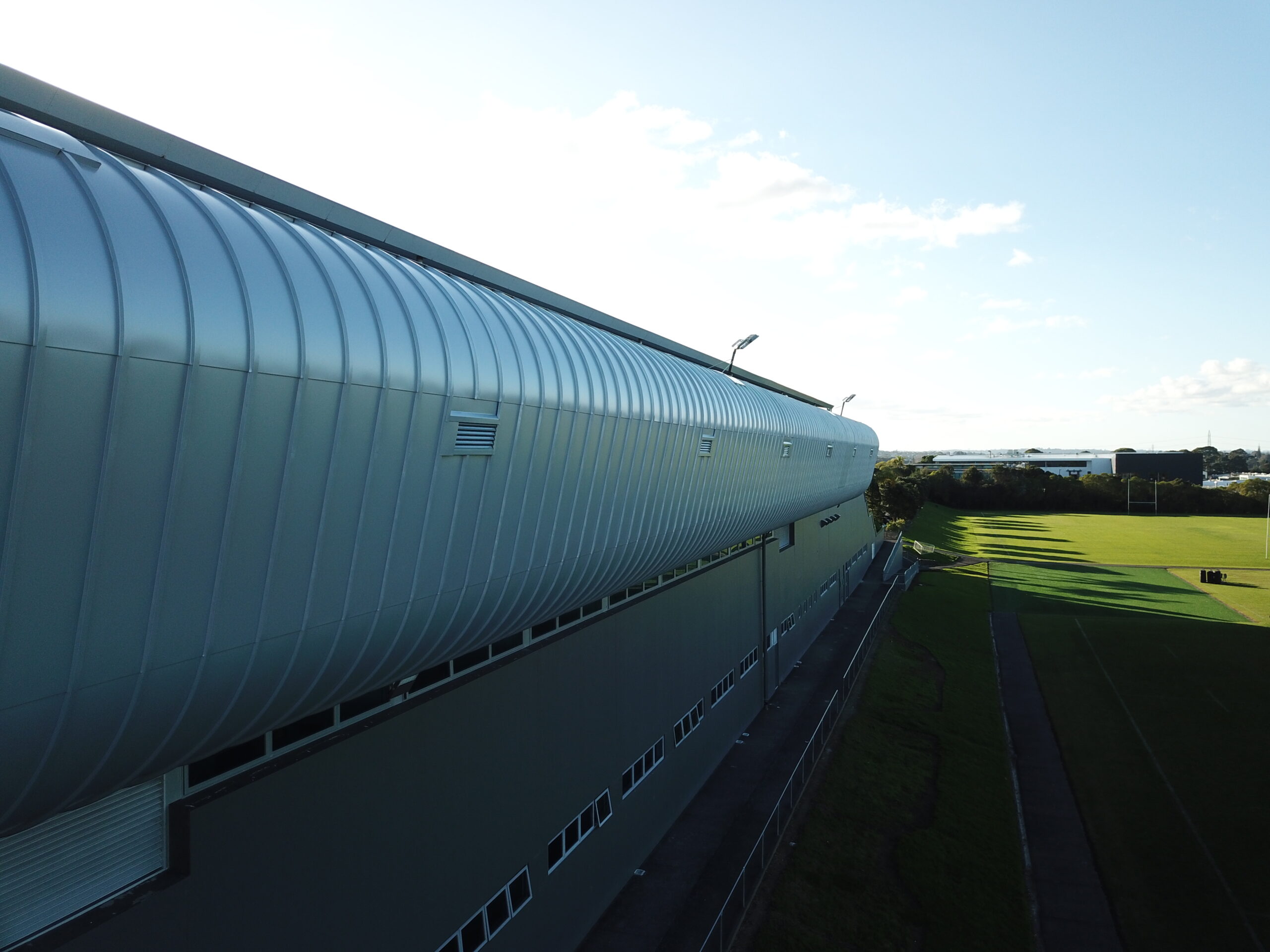 In 2019 the Trust Arean underwent a total transformation to the exterior cladding which was originally installed using ACM or otherwise known as composite panel. Unfortunately, the limited life span of this exterior cladding reached its final stages and water ingress though the shrinking silicone joins threatened the overall structure of the arena’s exterior. The brief was to reinstate the exterior of the Arean with a product that would not deviate too far from the original look but perform far better in all areas with a more modern architectural look. A material that was malleable enough to form the curves but still provided integrity and would function in a way that would long outperform the previous materials life service. EURAMAX premium pre-coated Auminium was the perfect solution for all visual and functional aspects required as well as the ability to provide the ultimate architectural exterior 3L PVDF paint system. The expertise and modern equipment of the European supplier could only produce such a robust yet perfectly suitable topcoat system delivering maximum warrant. The architectural capabilities and skills of Professional Roofing assisted by Roofing Industries ensured the curved roll cap profile could move freely with expansion demands and enable ventilation throughout the envelope. The single skin exterior does not require clunky silicone joins like the predecessor yet mends together with traditional methods using the 0.80mm Aluminium specified in a way to perform for the details needed. Today the Trust Areana contributes to the visual appeal of the area and will continue host many events in the years to come with an over 30-year visual life expectancy.